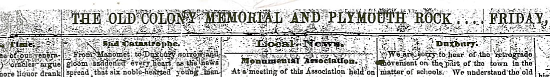Old Colony Memorial and Plymouth Rock front-page masthead, with “Sad Catastrophe” headline over the story of the tragedy. April 19, 1867. Click for larger version.